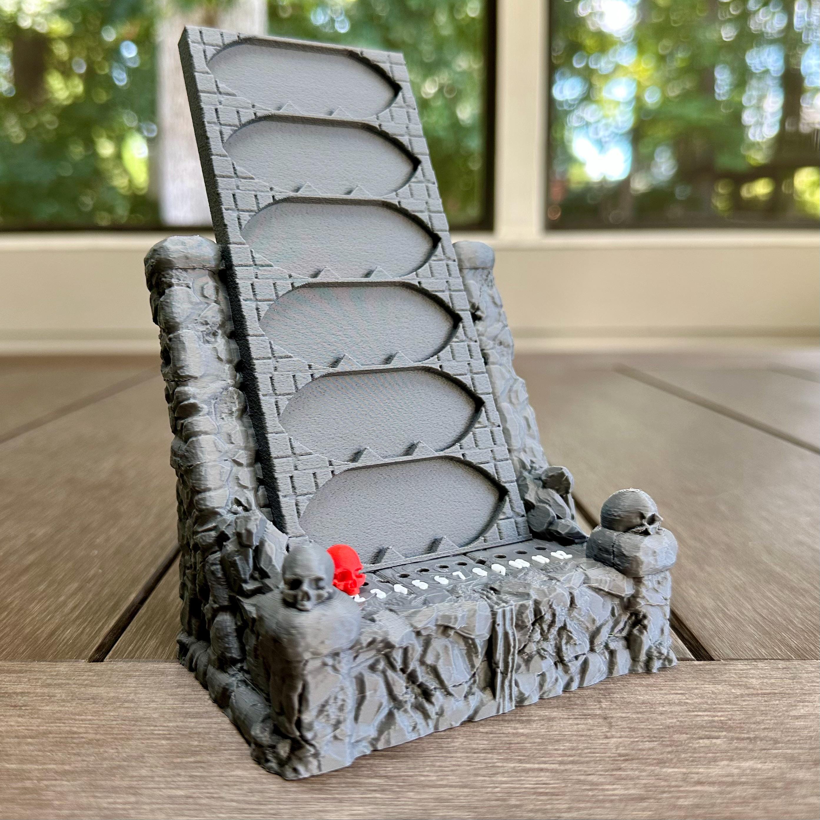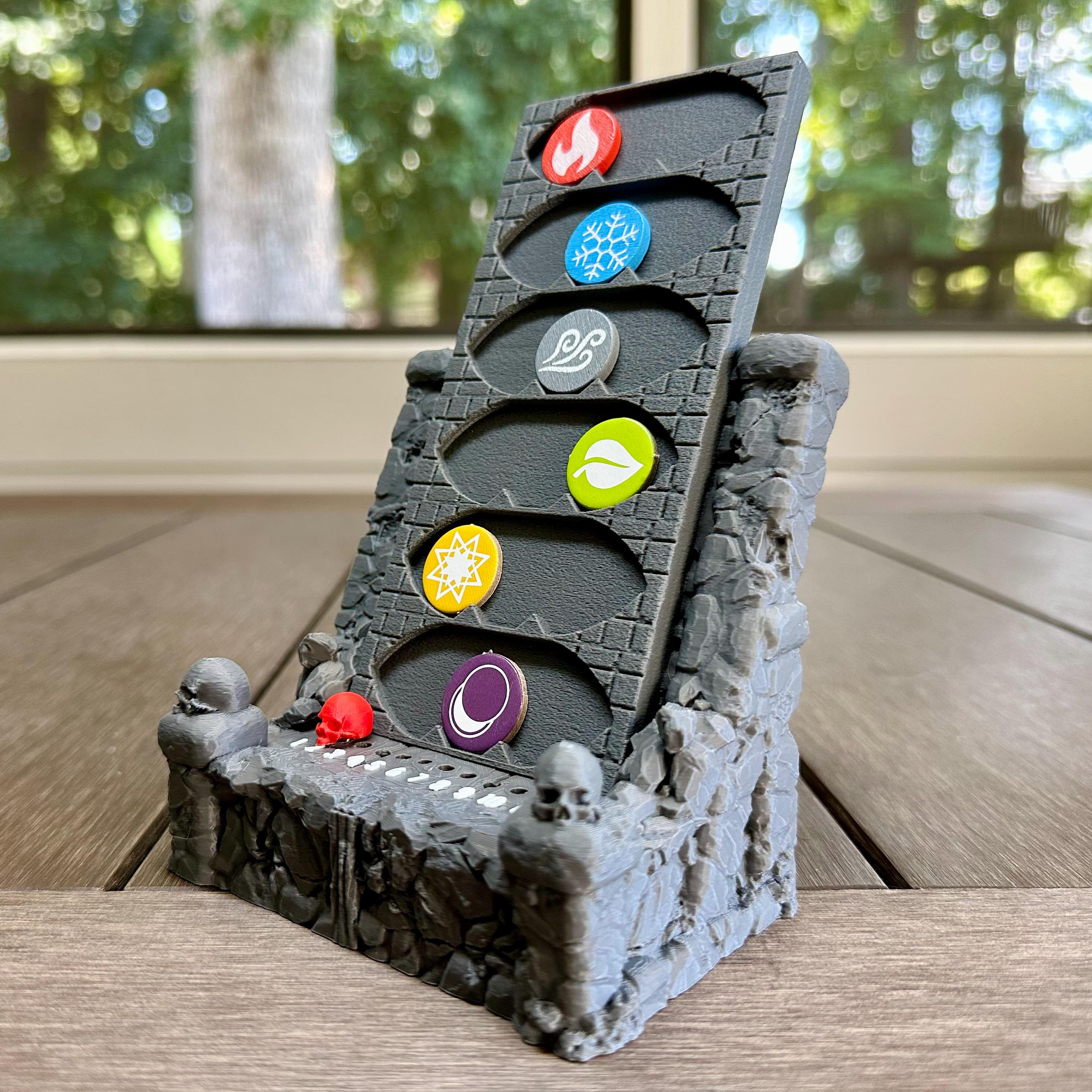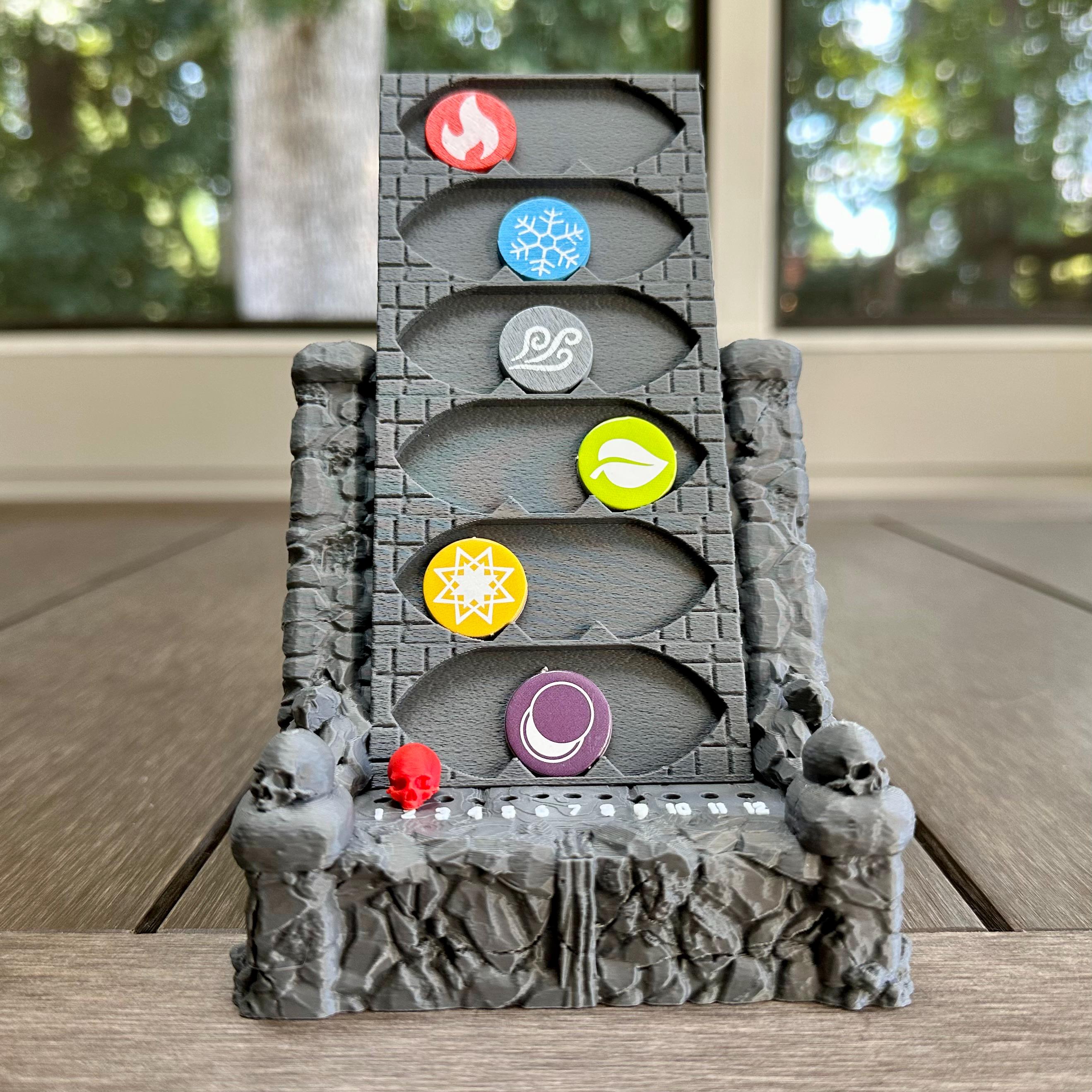 Ditch the flat cardboard and bring the elements to life! The Element & Round Tracker is a vertical display that brings order and visibility to your Gloomhaven, Frosthaven, Jaws of the Lion, Forgotten Circles, and Crimson Scales scenarios. Elemental infusions are easy to monitor at a glance, and the skull marker makes round tracking simple.